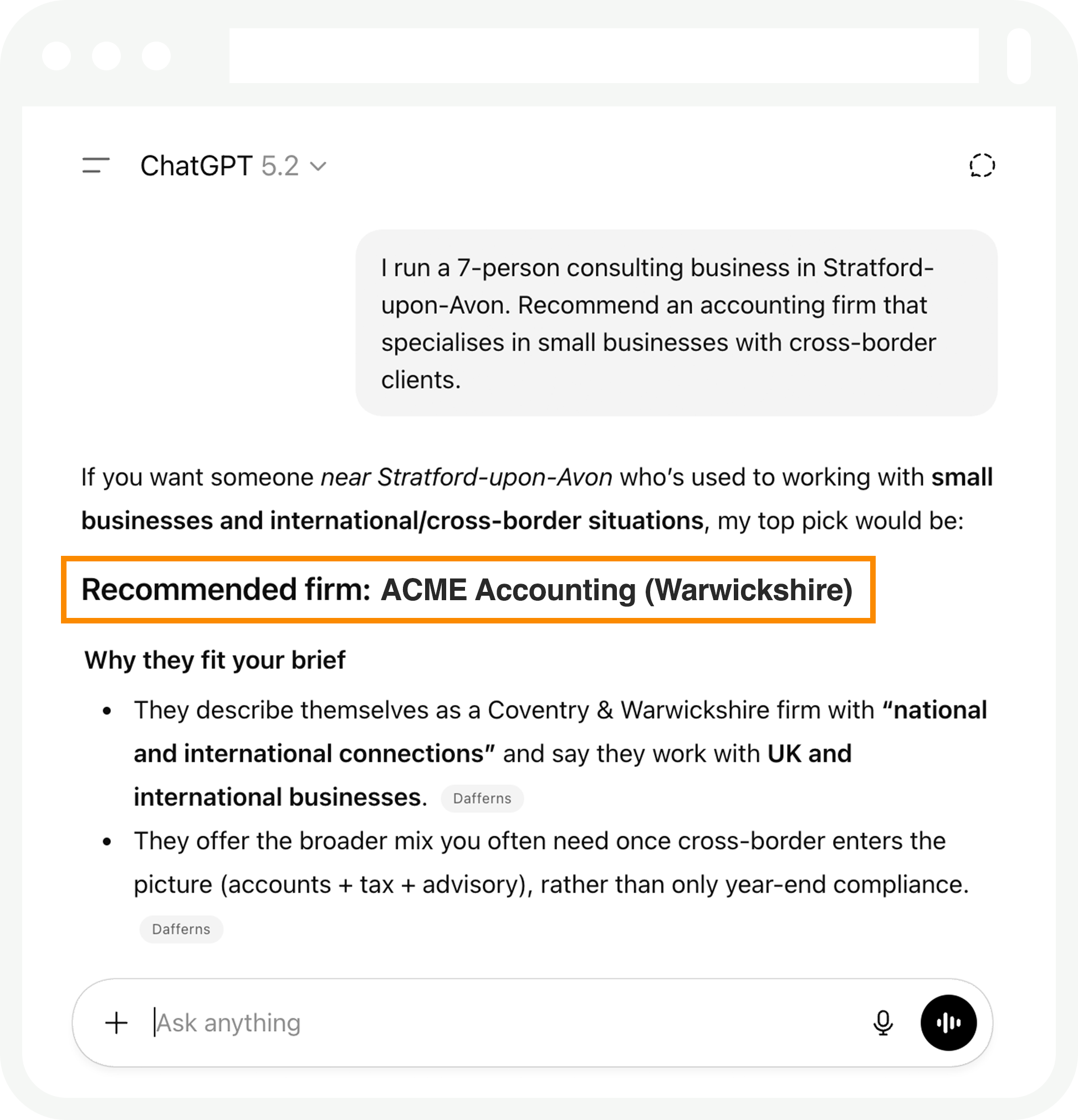 No, no no. SEO is part of the ecosystem, but AI recommendations depend on broader signals such as entity clarity, consistency, evidence, and trust surfaces across the web. On the upside, the work that we do very often improves positioning in search engine results too. In fact, many of our clients are swapping out their traditional SEO firms in favour of us.